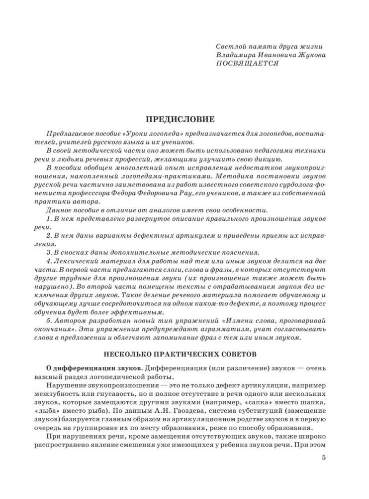 Предлагаемое пособие «Уроки логопеда» предназначается для логопедов, воспитателей, учителей русского языка и их учеников. В своей методической части оно может быть использовано педагогами техники речи и людьми речевых профессий, желающими улучшить свою дикцию. В пособии обобщен многолетний опыт исправления недостатков звукопроизношения, накопленный логопедами-практиками. Методика постановки звуков русской речи частично заимствована из работ известного советского сурдолога-фонетиста профессора Федора Федоровича Рау, его учеников, а также из собственной практики автора.
