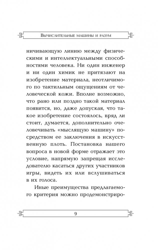 Впервые опубликованная еще в 1950 году, его знаменитая статья «Вычислительные машины и разум» стала одной из самых издаваемых и обсуждаемых работ в области информатики и кибернетики. Что и неудивительно – ведь именно в ней Тьюринг впервые сформулировал само понятие искусственного интеллекта и задал сакраментальный вопрос: «Может ли машина мыслить?» Так могут ли думать компьютеры? Тьюринг, при всей своей гениальности, был человеком практического склада ума и научно-фантастическими вопросами не задавался, а потому поставил вопрос несколько иначе: может ли компьютер совершать действия, не отличимые от обдуманных действий человека? И что, собственно, такое искусственный интеллект и чем он отличается от человеческого? И почему неверно считать, что компьютер, в отличие от человека, не способен на самопознание? На некоторые вопросы Тьюринга в наши дни уже дан ответ. Но многие из них так и повисли в воздухе в ожидании нового гения…