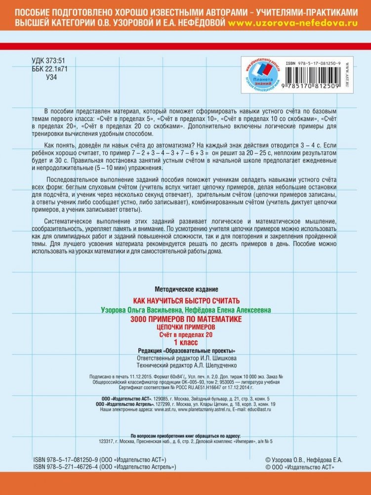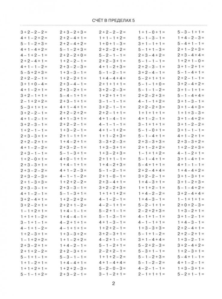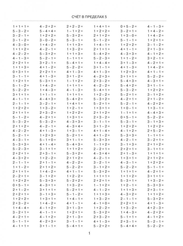 В пособии представлен материал, который поможет сформировать навыки устного счета по базовым темам первого класса: «Счет в пределах 5», «Счет в пределах 10», «Счет в пределах 10 со скобками», «Счет в пределах 20», «Счет в пределах 20 со скобками», а также логические примеры для тренировки вычисления удобным способом. Как понять, доведен ли навык счёта до автоматизма? На каждый знак действия отводится 3-4 с. Если ребёнок хорошо считает, то пример 7–2+3–4–3+7–6+3= он решит за 20-25 с, неплохим результатом будет и 30 с. Правильная постановка занятий устным счетом в начальной школе предполагает ежедневные и непродолжительные (5 - 10 мин) упражнения. Последовательное выполнение заданий пособия поможет ученикам овладеть навыками устного счета всех форм: беглым слуховым счетом (учитель вслух читает цепочку примеров, делая небольшие остановки для подсчёта, и ученик через несколько секунд отвечает), зрительным счетом (цепочки примеров записаны, а ответы ученик либо сообщает устно, либо записывает), комбинированным счетом (учитель диктует цепочки примеров, а ученик записывает ответы). Систематическое выполнение этих заданий развивает логическое и математическое мышление, сообразительность, укрепляет память и внимание. По усмотрению учителя цепочки примеров можно использовать как для олимпиадных работ и заданий повышенной сложности, так и для повторения и закрепления пройденной темы. Для лучшего усвоения материала рекомендуется решать по десять примеров в день. Пособие можно использовать на уроках математики и для самостоятельной работы дома.