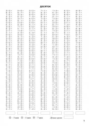 Данное пособие содержит 3000 примеров на сложение и вычитание в пределах десяти. Тема «ДЕСЯТОК» – одна из базовых тем начальной школы для первого класса. Если она закреплена плохо, то у школьников будут многочисленные ошибки и в последующих темах (счёт в пределах 20 без перехода через десяток, с переходом через десяток, в пределах 100 и т.д.). Многие родители шести – семилетних школьников убеждены, что их дети очень хорошо считают в пределах десятка. Но полностью можно быть в этом уверенными только тогда, когда навык счёта доведён до автоматизма. В этом случае ответ к примеру ученик пишет по истечении 2 – 3 секунд.