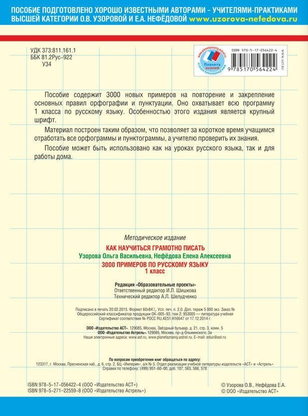 Пособие содержит 3000 новых примеров на повторение и закрепление основных правил орфографии и пунктуации. Оно охватывает всю программу 1 класса по русскому языку. Особенностью этого издания является крупный шрифт. Материал построен таким образом, что позволяет за короткое время учащимся отработать все орфограммы и пунктограммы, а учителю проверить их знания. Пособие может быть использовано как на уроках русского языка, так и для работы дома.