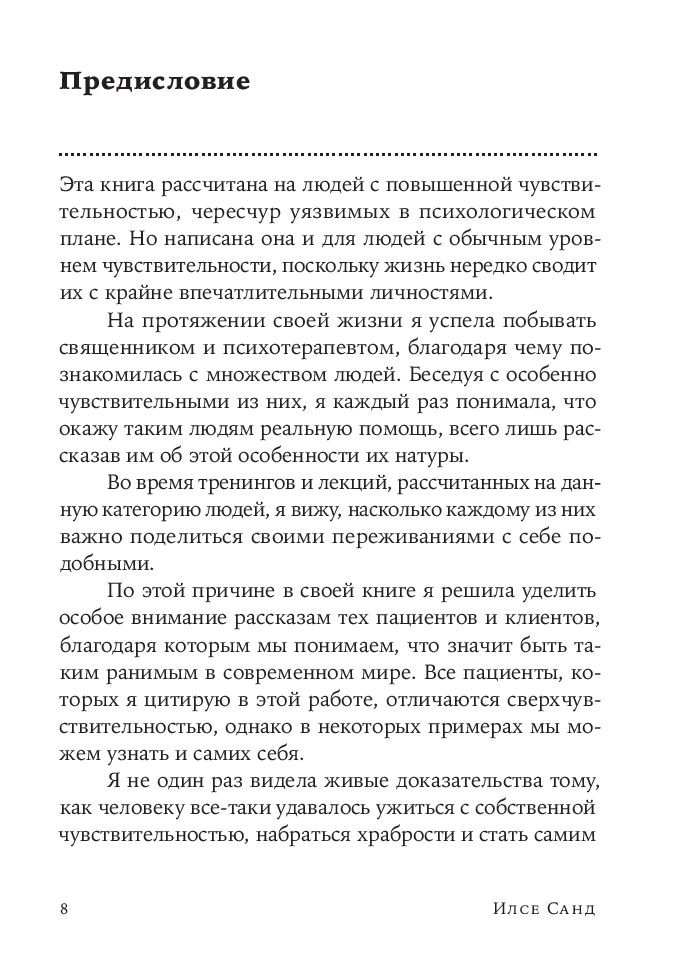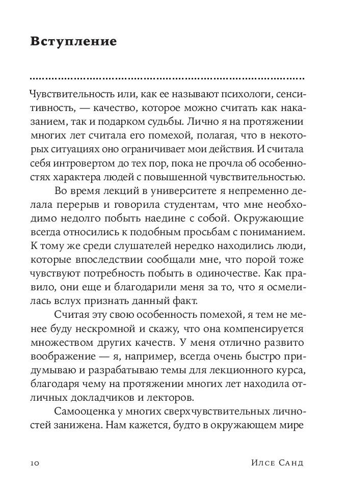 Высокочувствительные люди, или «новые интроверты», — так называют тех, кто острее других реагируют на шум или суету, быстро устают от общества и любят уединение. Эти люди тонко чувствуют мир и обращают внимание на мельчайшие детали, поэтому из них нередко получаются прекрасные поэты, художники и писатели. Однако жить среди других им тяжело: слишком часто приходится оправдываться за свою усталость и нелюдимость, слишком ранит критика, слишком много сил уходит на сопереживание, а также на то, чтобы соответствовать принятым в обществе стандартам. Илсе Санд, датский писатель и дипломированный психотерапевт, на собственном опыте постигшая все тяготы и радости жизни высокочувствительных людей, рассказывает, как новые, интроверты наконец могут перестать пытаться перестроить себя и начать жить в свое удовольствие в гармонии с собой и своими чувствами.