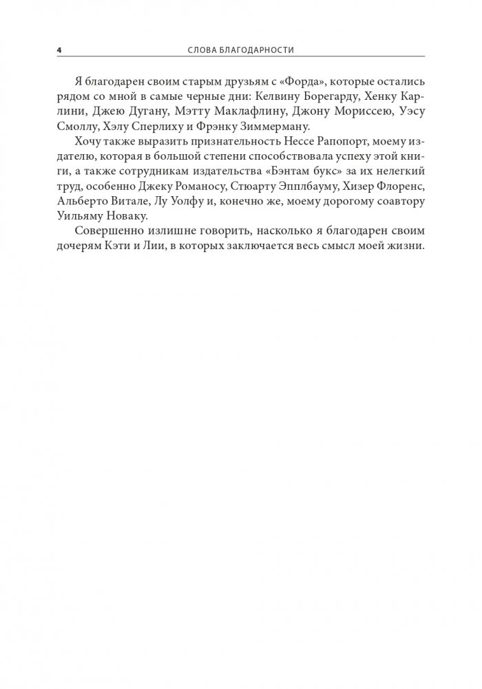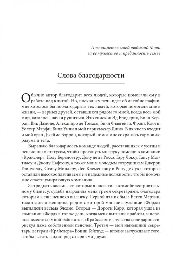Ли Якокка — легенда американского менеджмента, решительный бизнесмен, который, вытащив «Крайслер» из пропасти, стал телезвездой и человеком, которого многие прочили в президенты США. Сын итальянского иммигранта Ли Якокка вырос в компании «Форд» до должности президента и возглавлял ее на протяжении восьми лет — однако интриги в высших эшелонах управления едва не погубили его карьеру. В обычном для него язвительном и критическом стиле он излагает читателю историю собственной жизни.