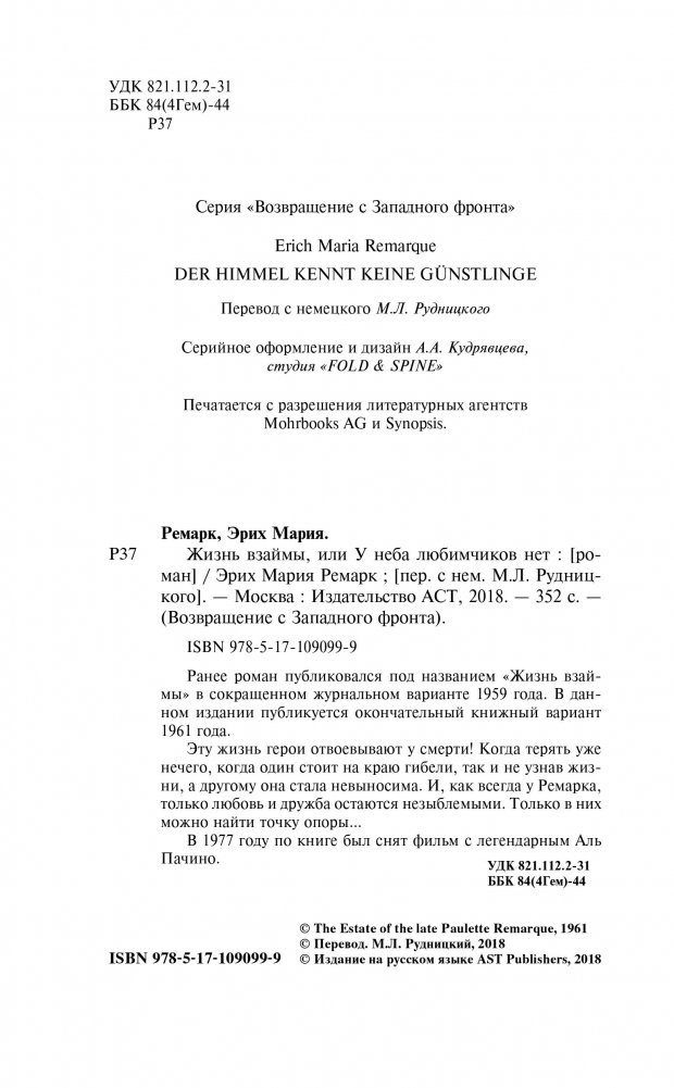 Ранее роман публиковался под названием «Жизнь взаймы» в сокращенном журнальном варианте 1959 года. В данном издании публикуется окончательный книжный вариант 1961 года. Эту жизнь герои отвоевывают у смерти! Когда терять уже нечего, когда один стоит на краю гибели, так и не узнав жизни, а другому она стала невыносима. И как всегда у Ремарка, только любовь и дружба остаются незыблемыми. Только в них можно найти точку опоры… В 1977 году по книге был снят фильм с легендарным Аль Пачино.