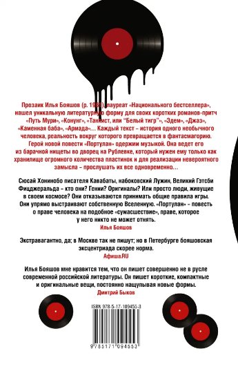 Прозаик Илья Бояшов (р. 1961), лауреат «Национального бестселлера», нашел уникальную литературную форму для своих коротких романов-притч «Путь Мури», «Конунг», «Танкист, или “Белый тигр”», «Эдем», «Джаз», «Каменная баба», «Армада»… Каждый текст – история одного необычного человека, реальность вокруг которого превращается в фантасмагорию. Герой новой повести «Портулан» одержим музыкой. Она ведет его из барачной нищеты во дворец на Рублевке, который нужен ему только как хранилище огромного количества пластинок и для реализации невероятного замысла – прослушать их все одновременно…